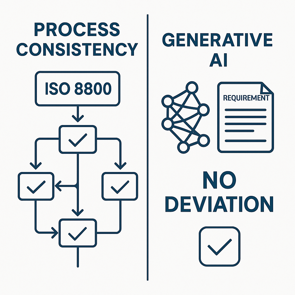 Aligned with standards such as ISO 8800, the company ensures AI integration through strict process consistency, prioritizing safety and reliability in compliance with recognized norms. - Generative AI for Development and Safety Justification